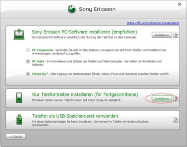 Möchten Sie die kompolette Sony Ericsson PC Software installieren, so klicken Sie auf Installieren.
